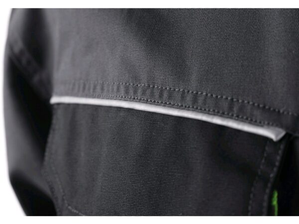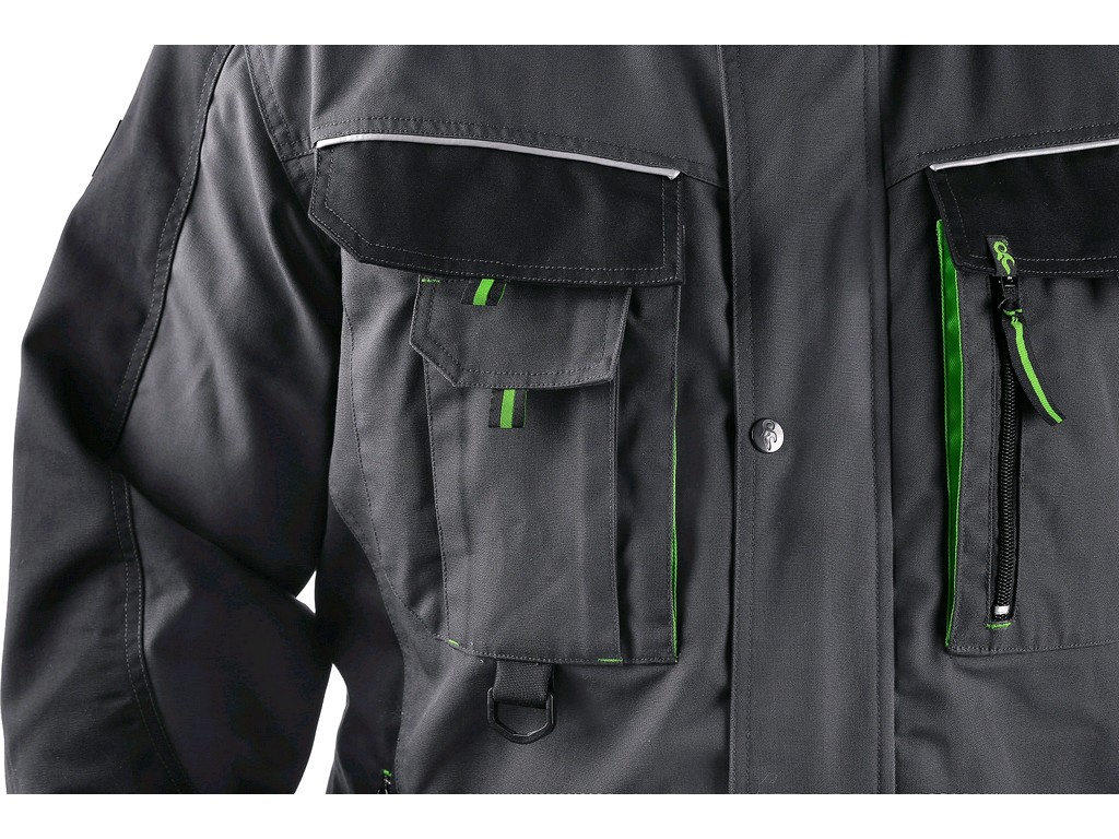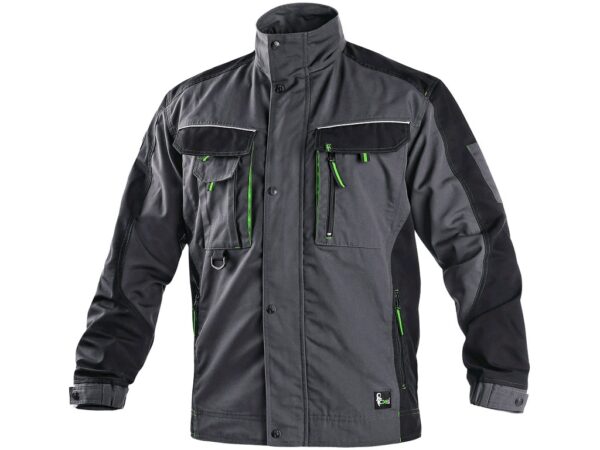 Męska bluza robocza – skrócona wersja dla wysokości 170-176 cm. Ramiona wzmocnione poliestrem 600D, rękawy z regulowanym mankietem, przykryte zapinanie na zamek i zatrzaski, wielofunkcyjne kieszenie na piersiach, boczne kieszenie na zamek, regulowany pas, elementy odblaskowe. Zalecane zastosowanie: budownictwo, inżynieria, przemysł lekki, przemysł samochodowy, logistyka, magazyn, spedycja, autoserwisy, utrzymanie, montaż, rolnictwo, ogród, hobby.