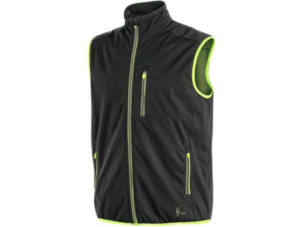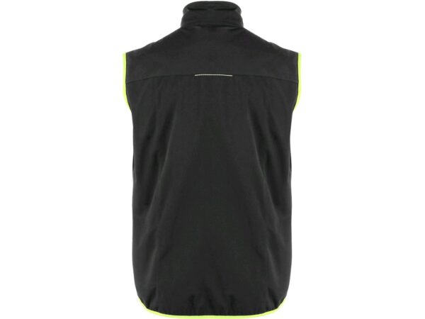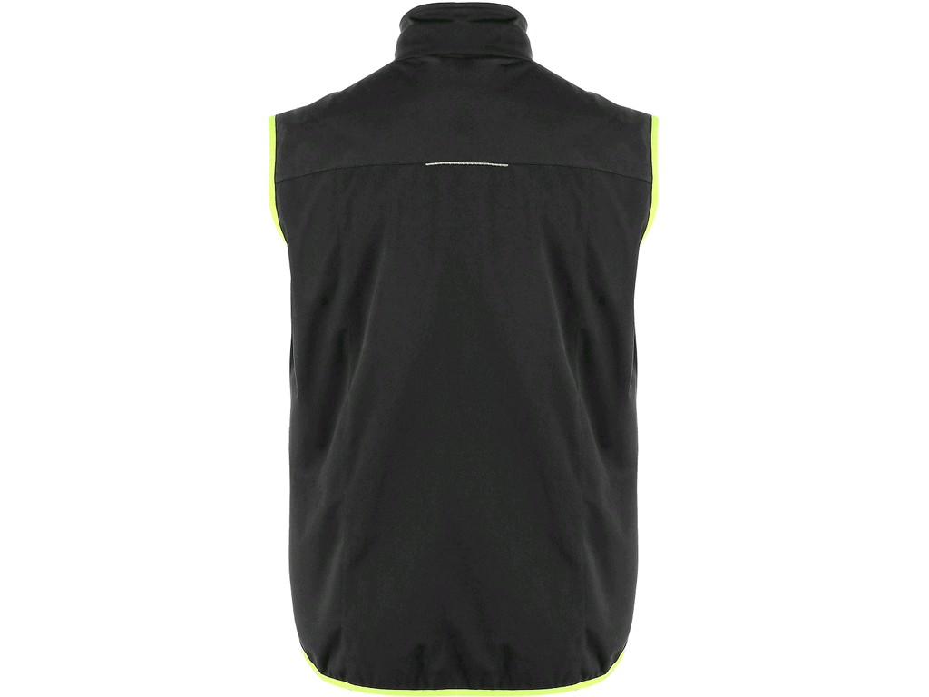 Lekka kamizelka softshellowa z elementami odblaskowymi, bez TPU membrany, dolny brzeg w gumkę, 3 zewnętrzne kieszenie na zamek, 3 wewnętrzne kieszenie, żółte elementy kontrastowe.