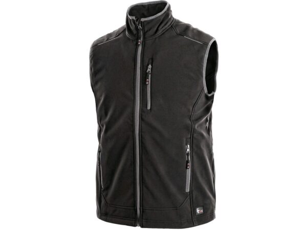Męska kamizelka softshellowa zapinana na zamek, kieszeń na piersi na zamek, 2 boczne kieszenie na zamek, TPU membrana, wodoodporność poza strefą szwów 3 000mm, paroprzepuszczalność 800g/m2/24godz.